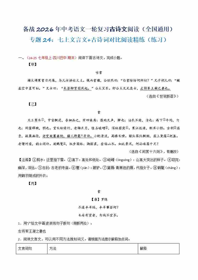 专题24:七上文言文古诗词对比阅读精练(练习)原卷版