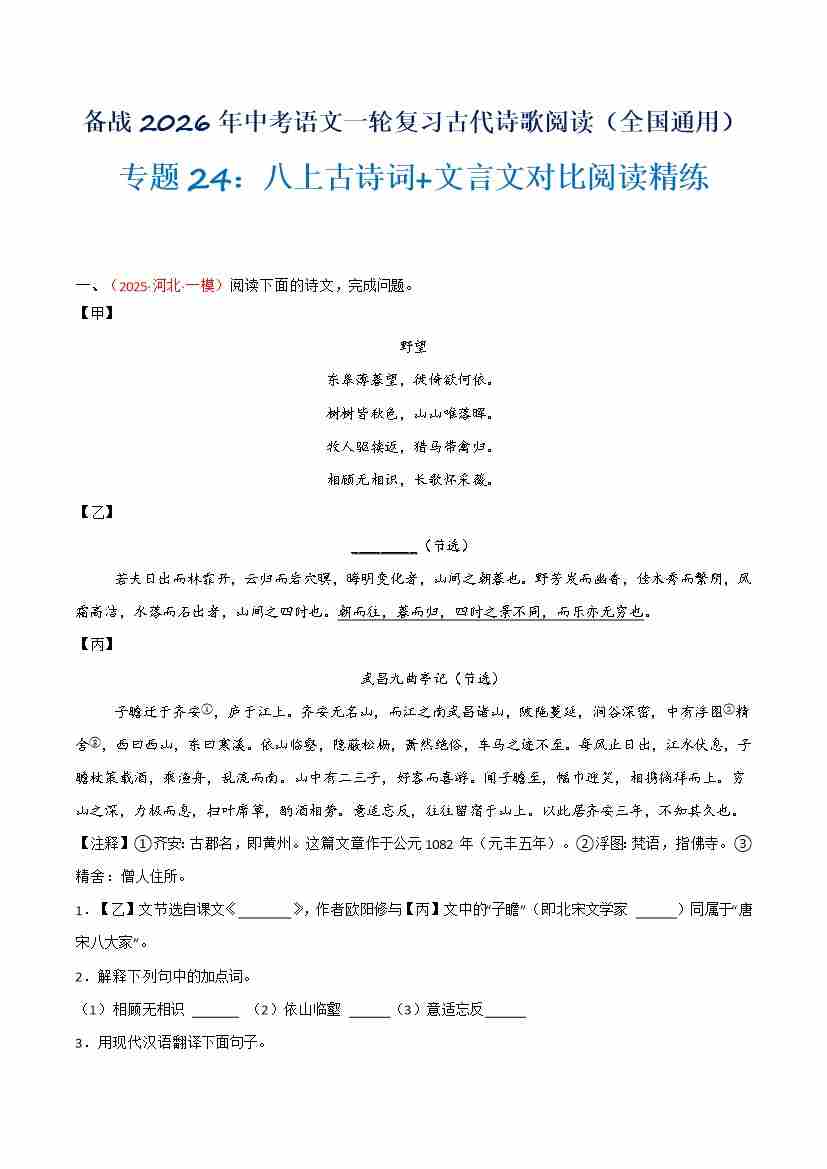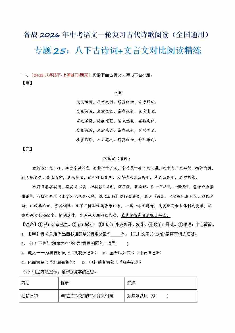 专题25:八下古诗词文言文对比阅读精练(练习)原卷版