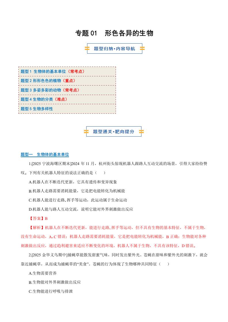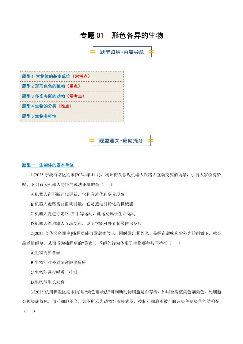 专题01 形色各异的生物(期末专项训练)(教师版)