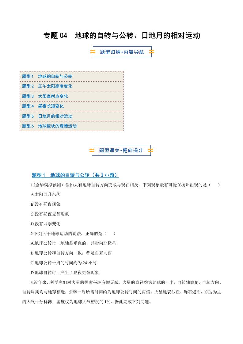 专题04 地球的自转与公转、日地月的相对运动(期末专项训练)(原卷版)