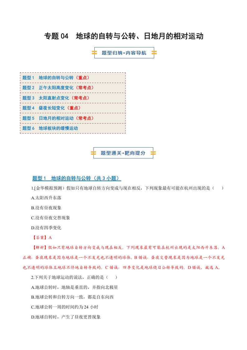 专题04 地球的自转与公转、日地月的相对运动(期末专项训练)(解析版)