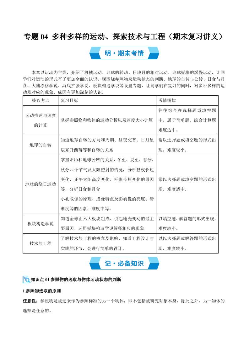 专题04 多种多样的运动、探索技术与工程(期末复习讲义)(原卷版)