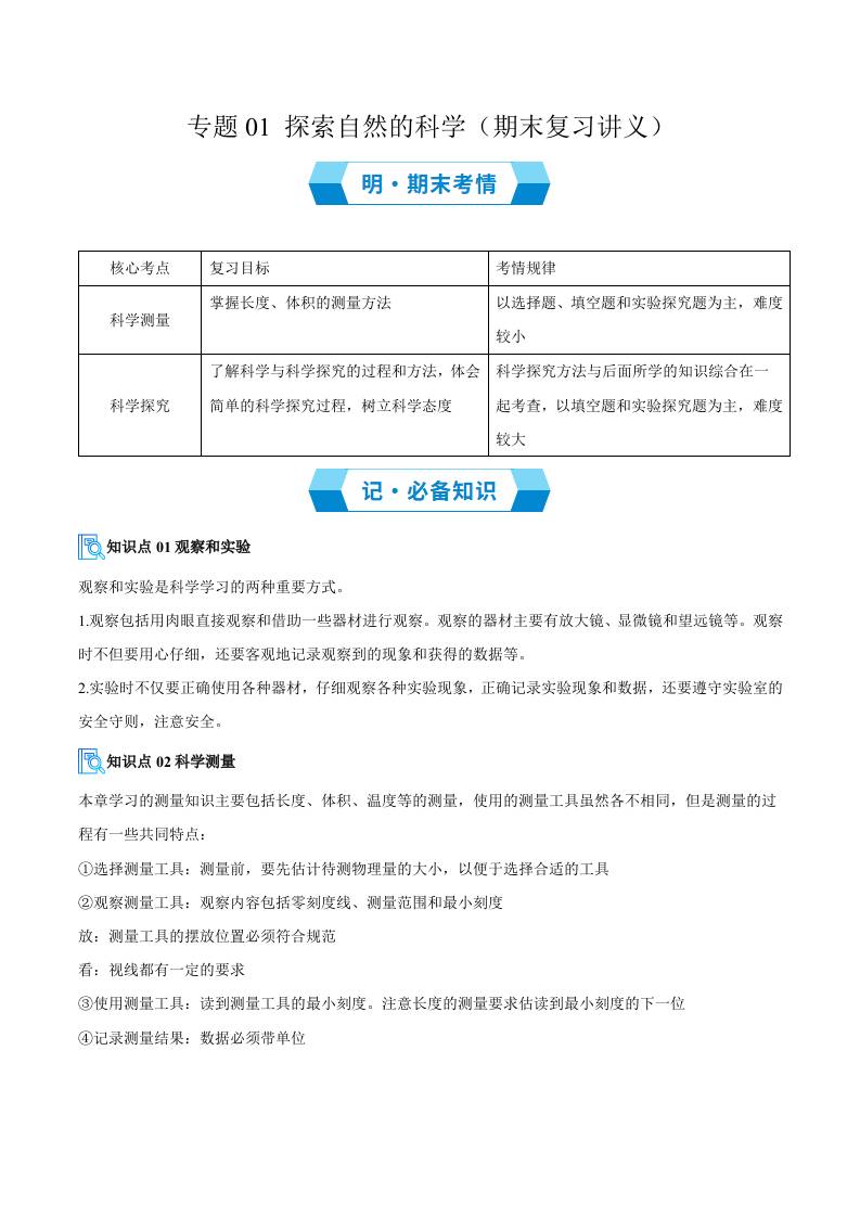 专题01 探索自然的科学(期末复习讲义)(学生版)