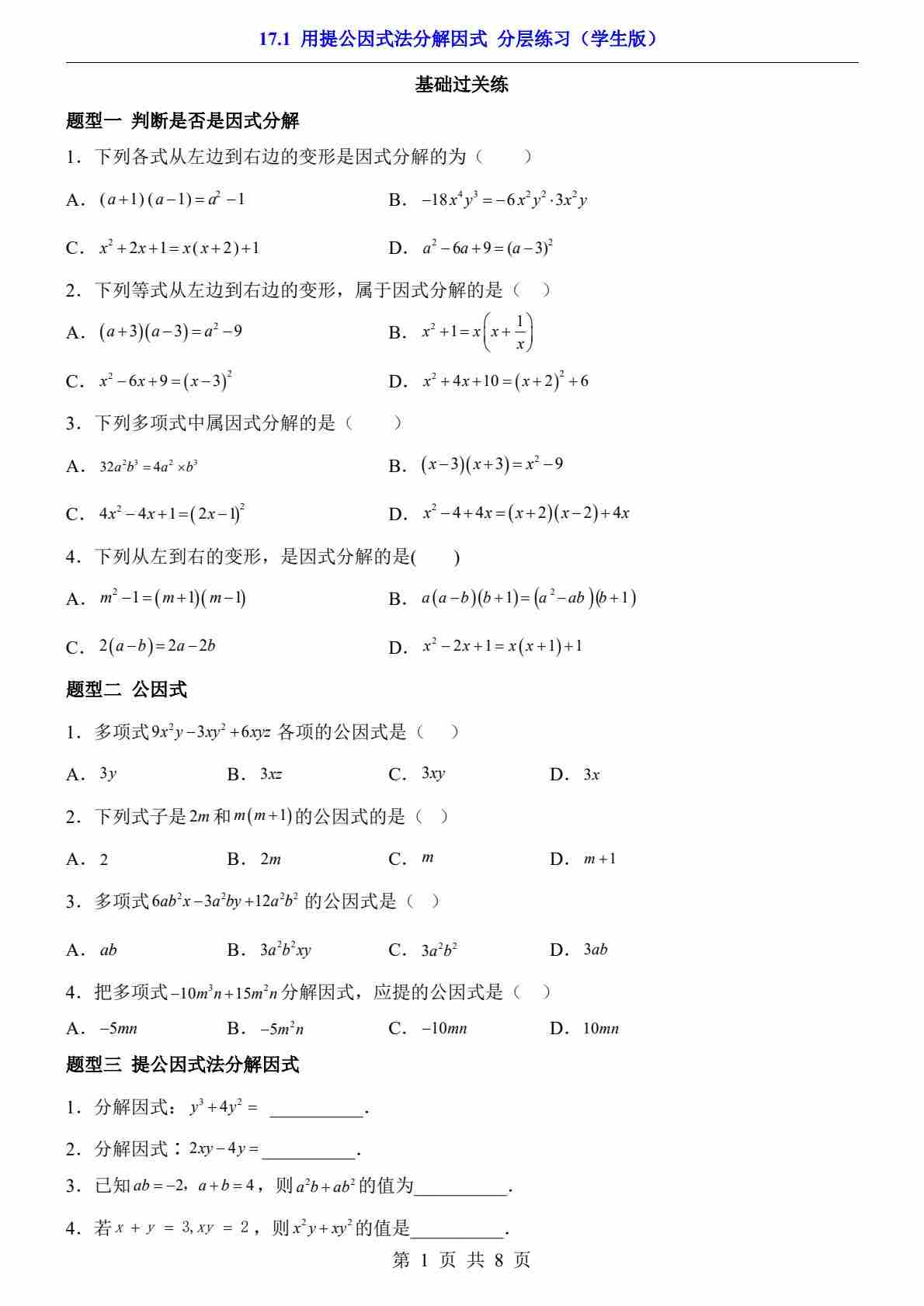 17.1 用提公因式法分解因式(分层练习)