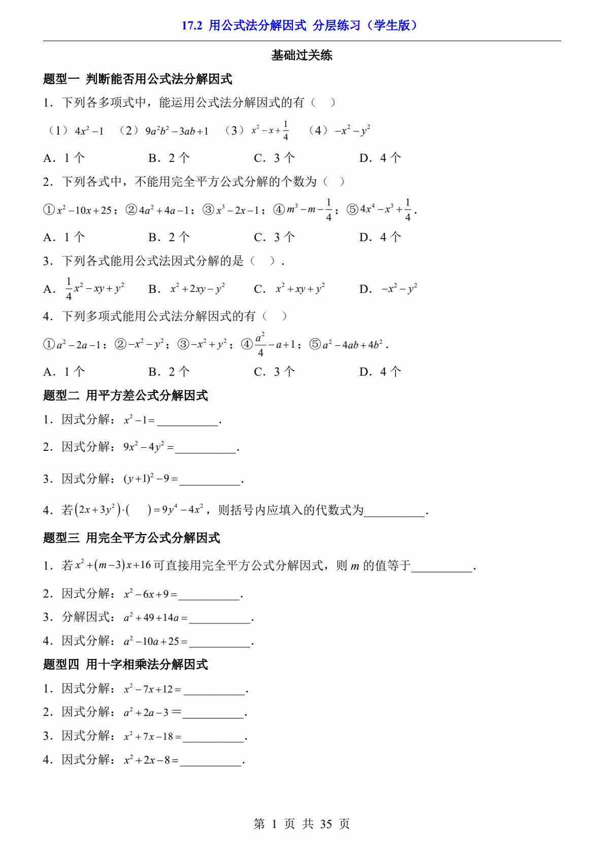 17.2 用公式法分解因式(分层练习)