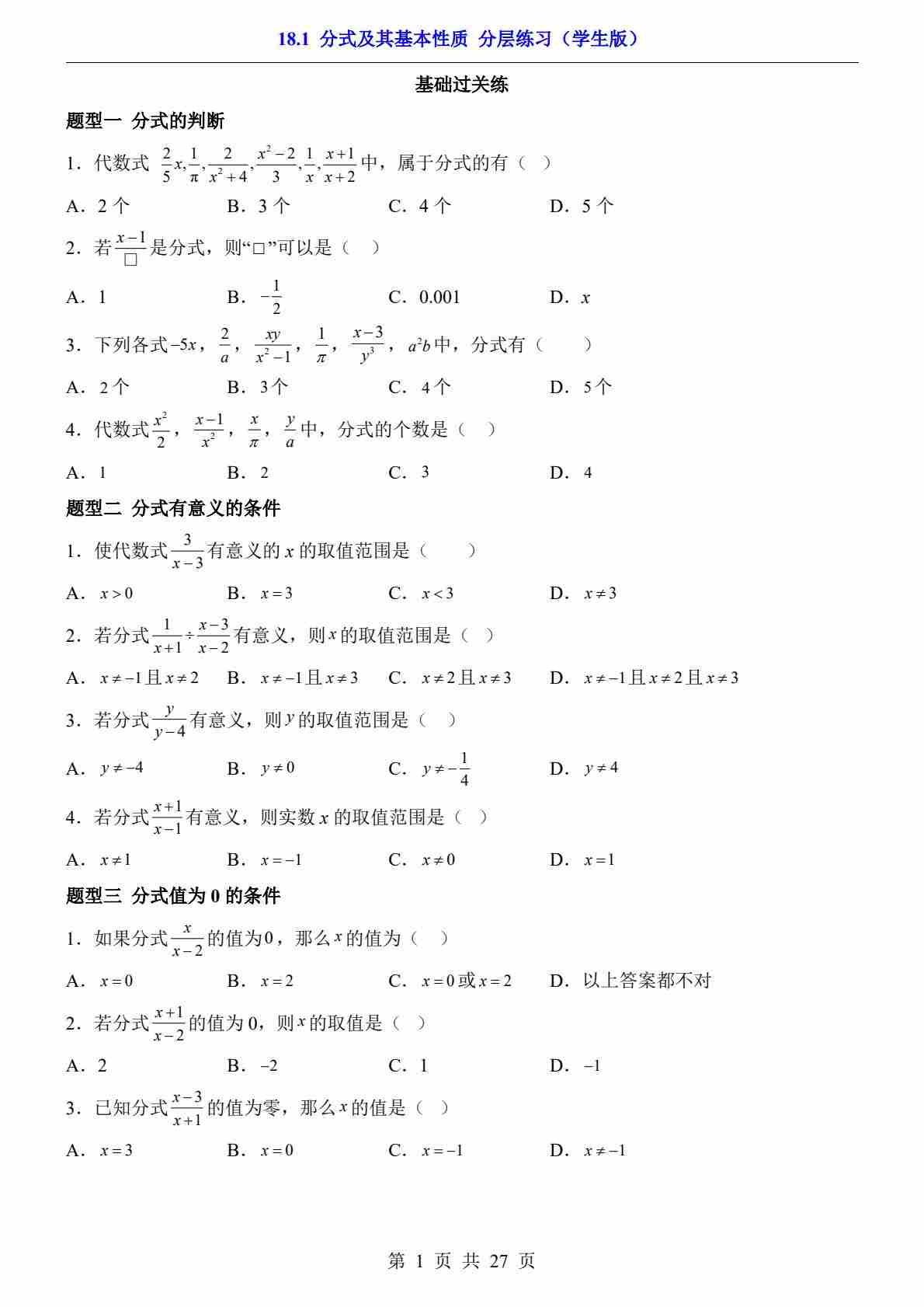 18.1 分式及其基本性质(分层练习)