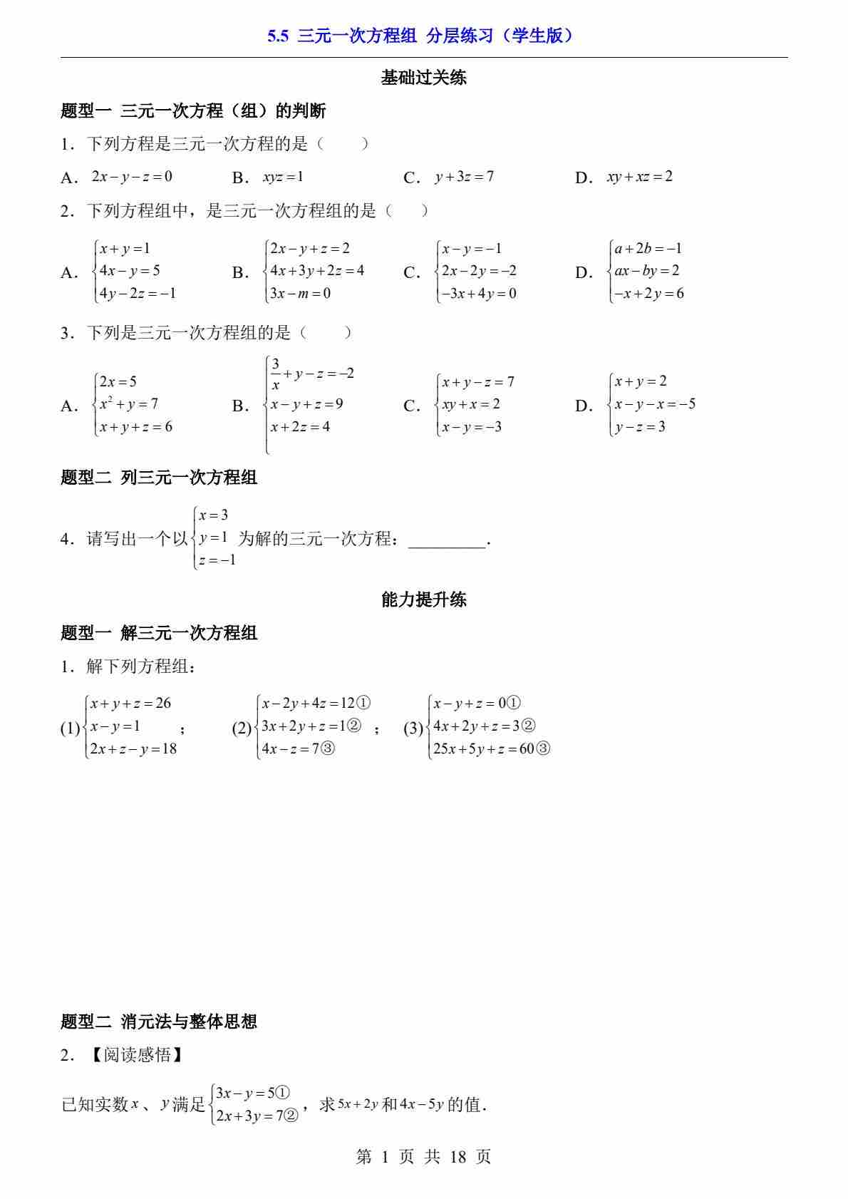5.5 三元一次方程组(分层练习)