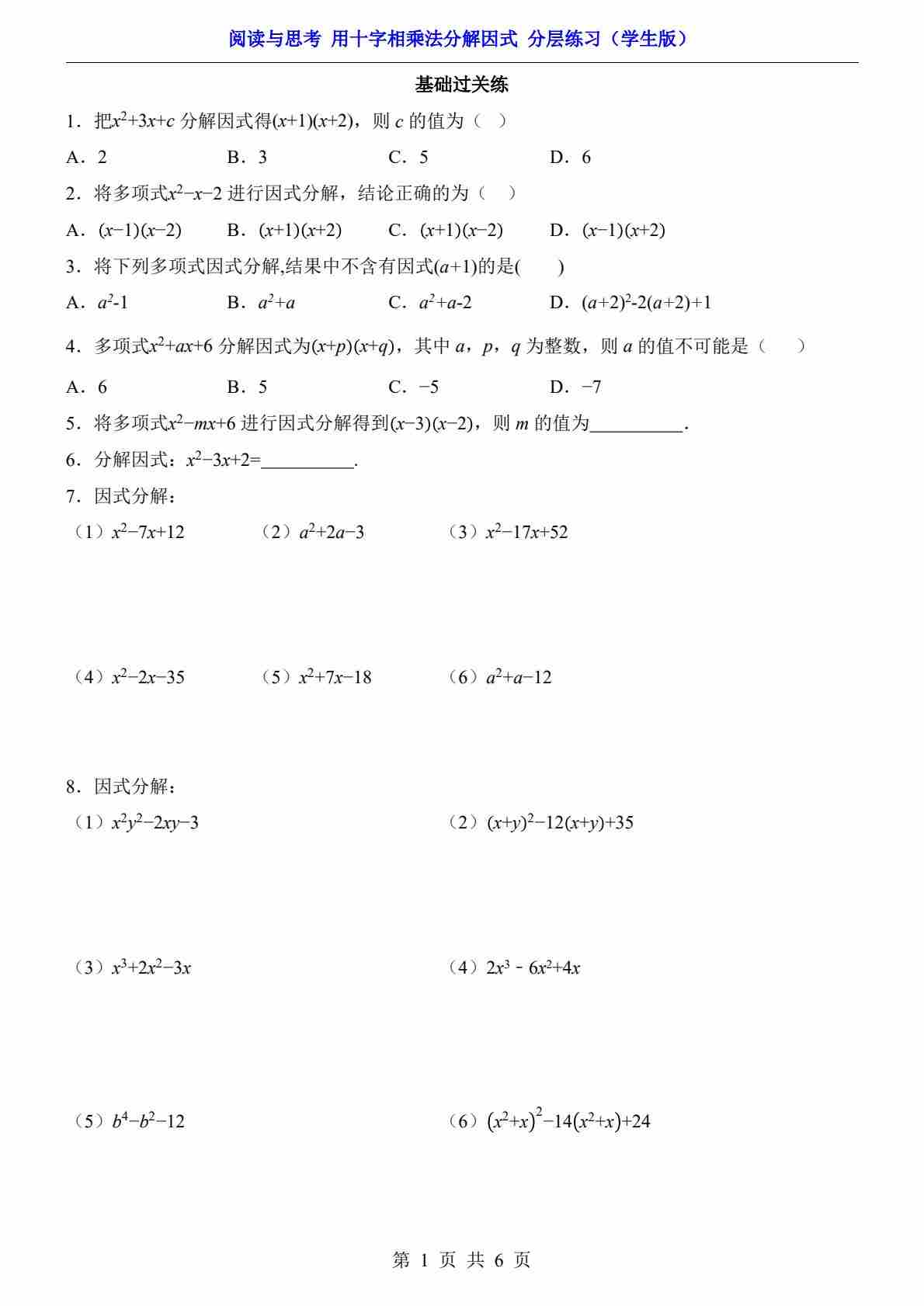 阅读与思考 用十字相乘法分解因式(分层练习)