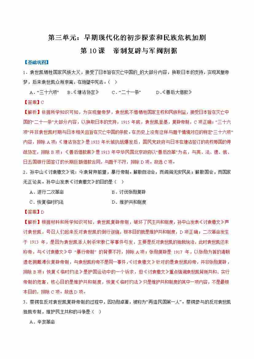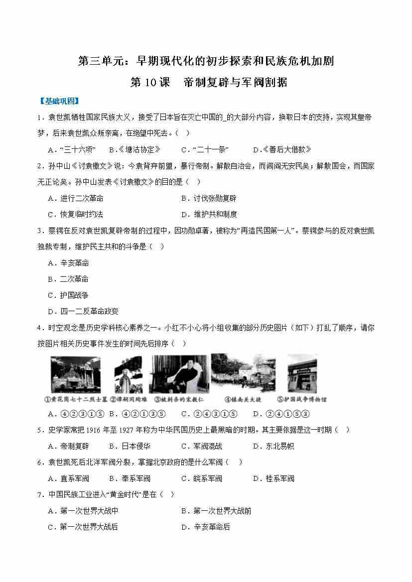 第10课帝制复辟与军阀割据(任务型分层作业)(原卷版)历史统编版2024八年级上册