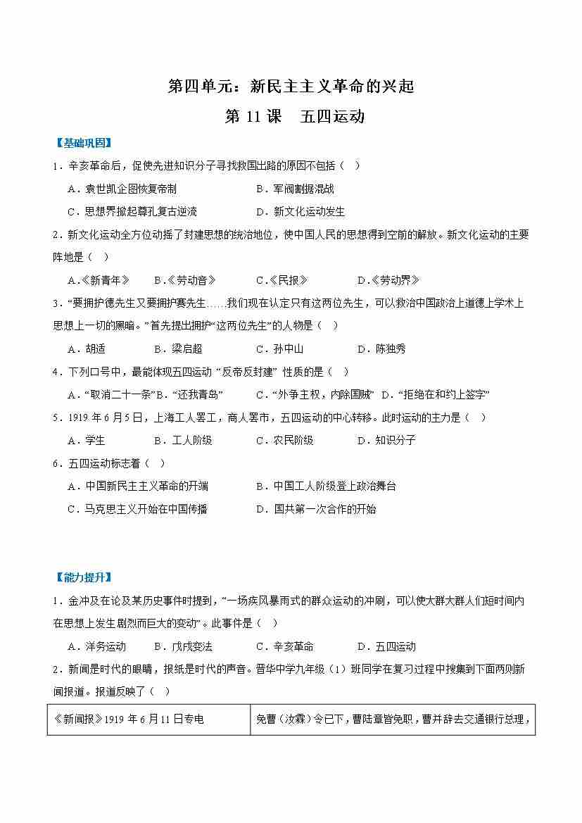 第11课五四运动(任务型分层作业)(原卷版)