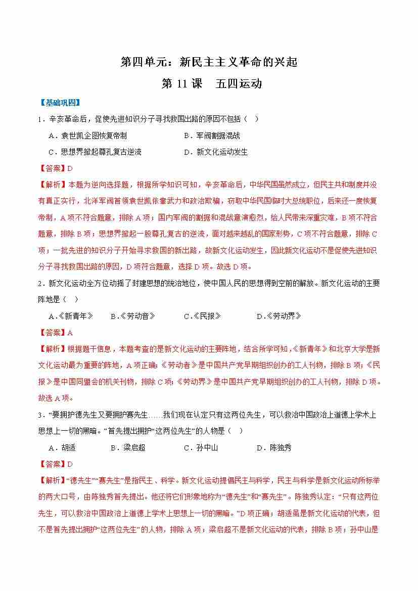 第11课五四运动(任务型分层作业)(解析版)