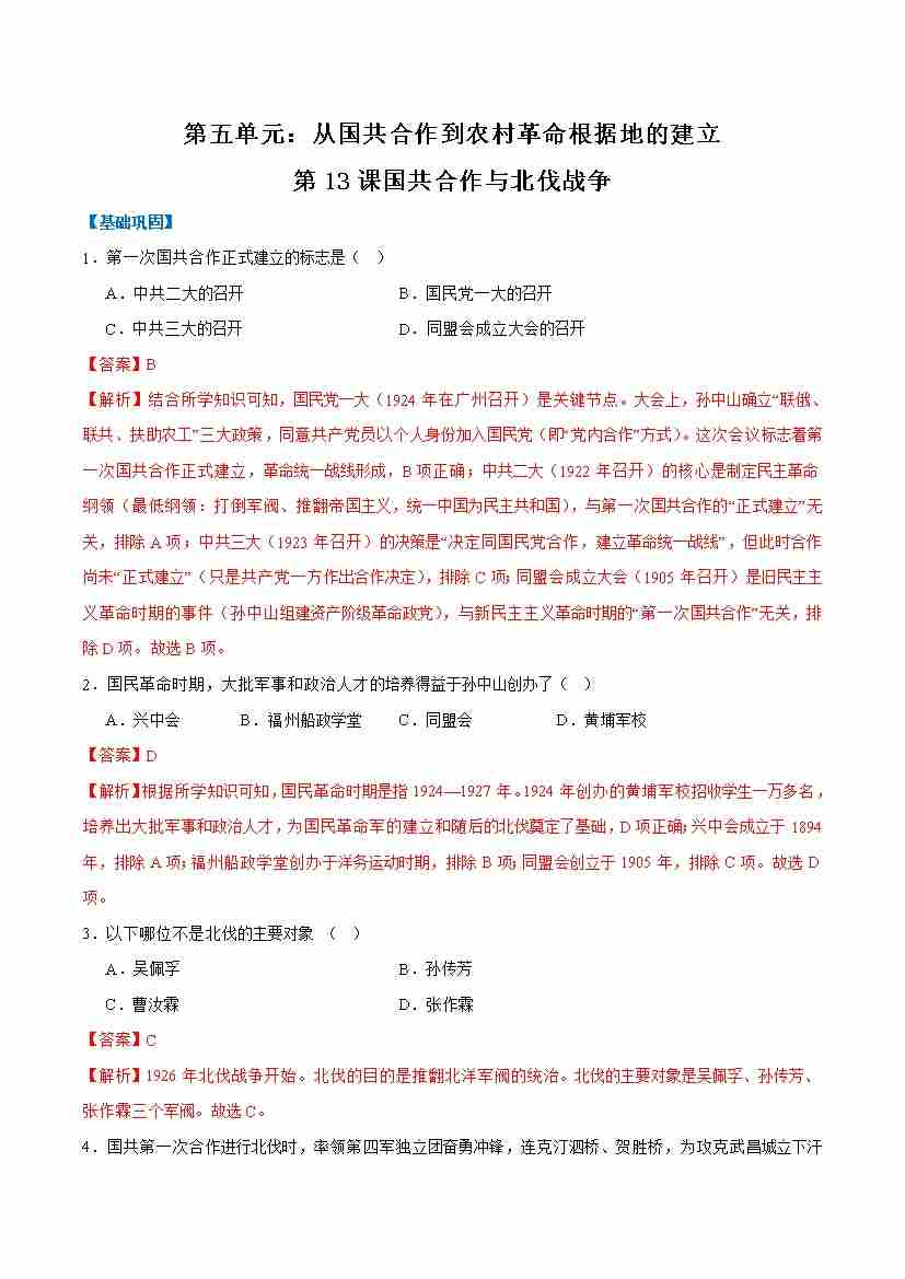第13课国共合作与北伐战争(任务型分层作业)(解析版)历史统编版2024八年级上册