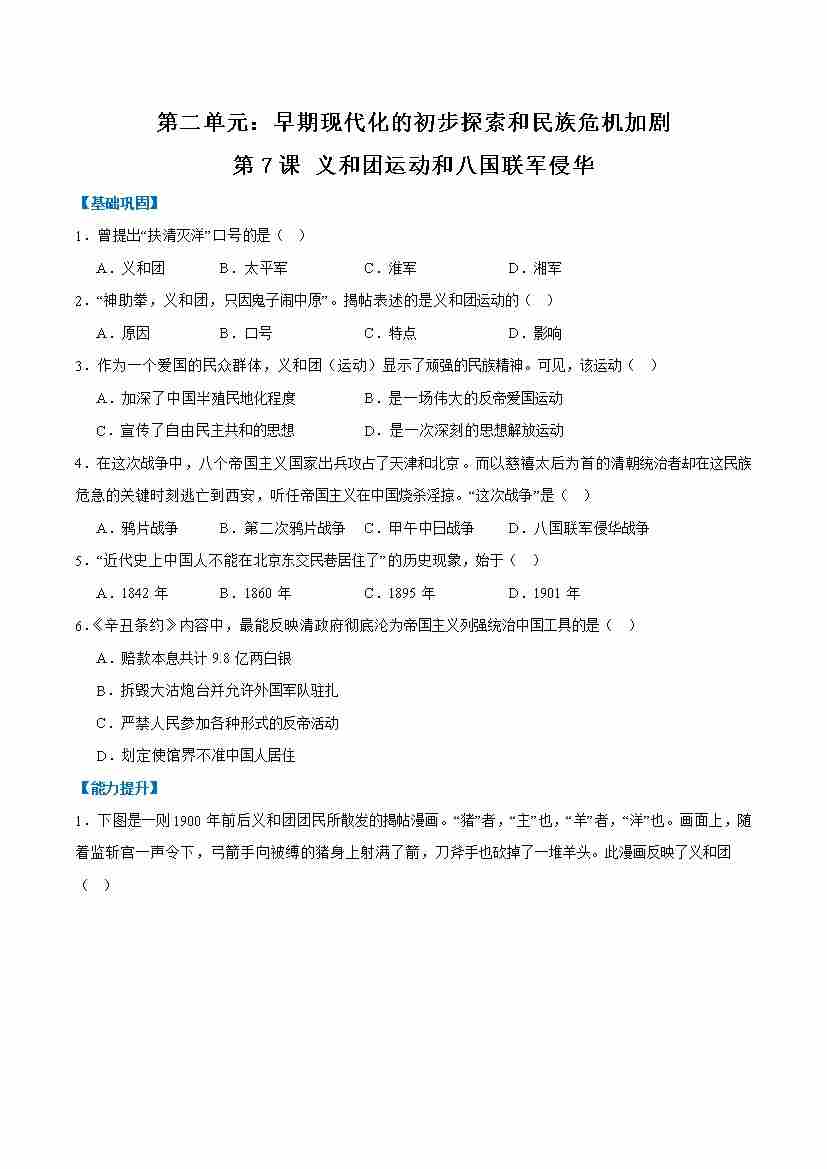 第7课 义和团运动和八国联军侵华(任务型分层作业)(原卷版)