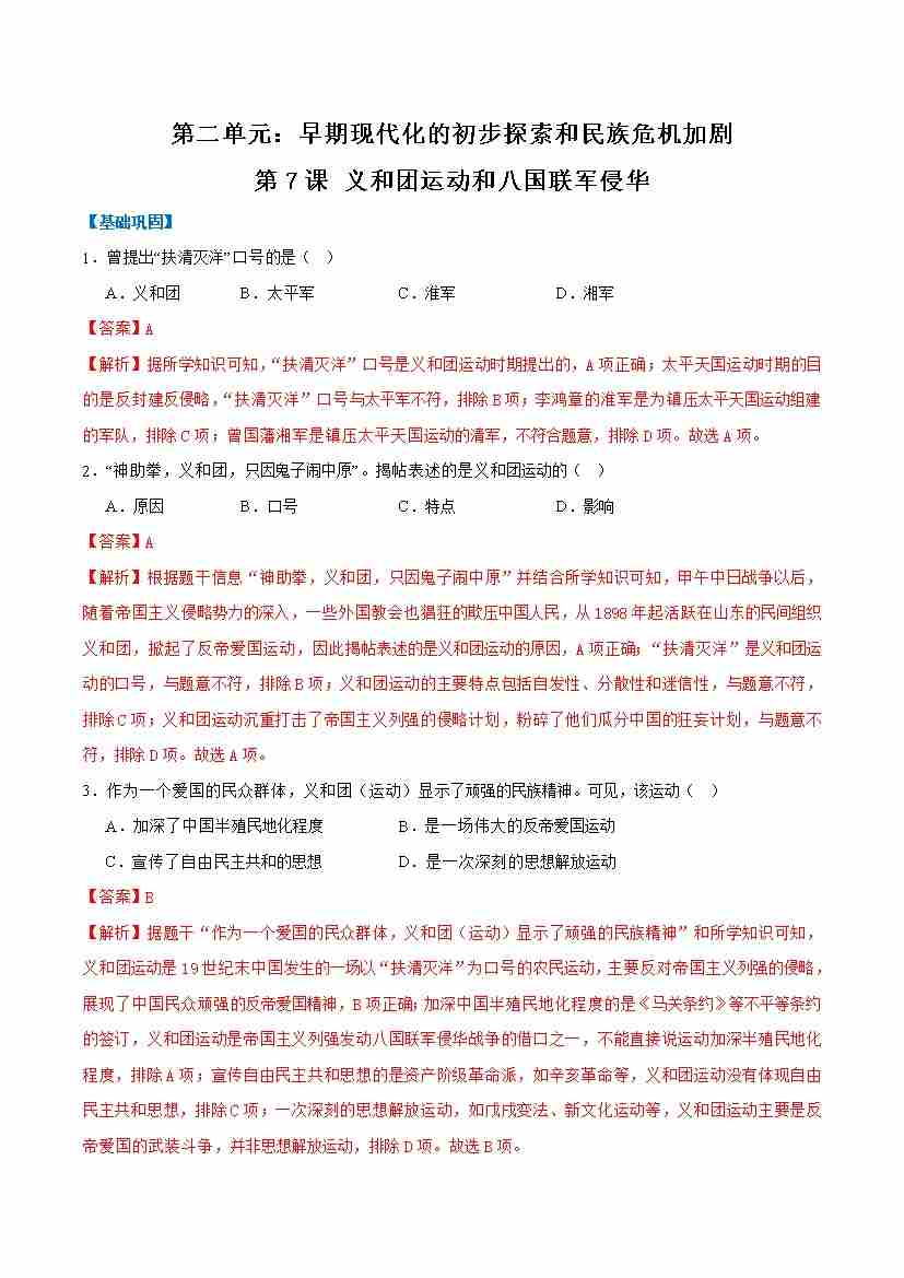 第7课 义和团运动和八国联军侵华(任务型分层作业)(解析版)