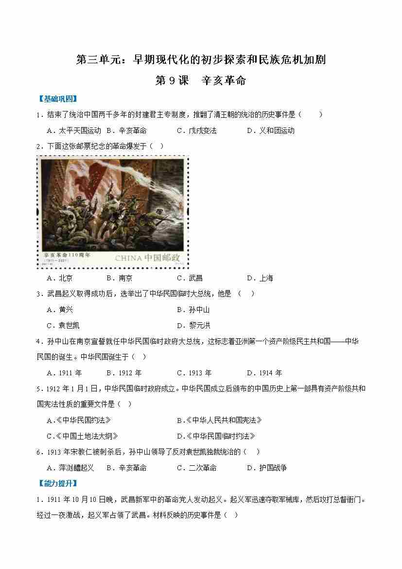 第9课辛亥革命(任务型分层作业)(原卷版)