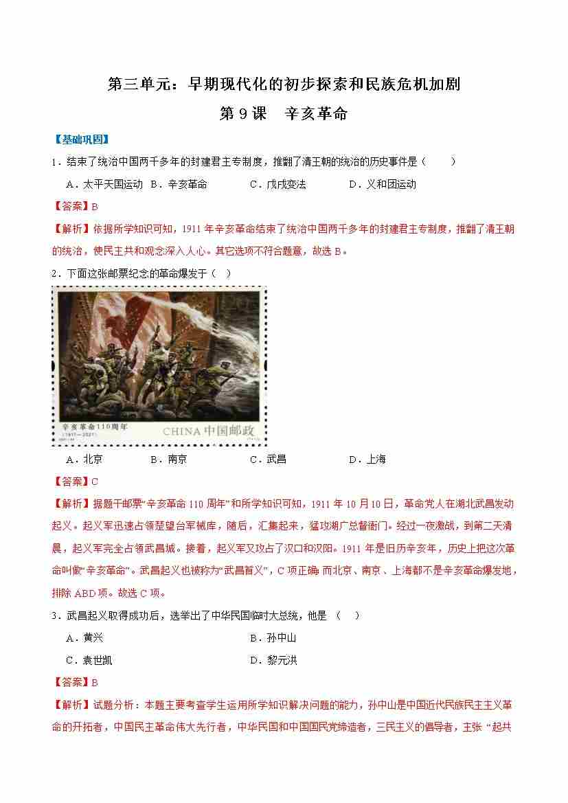 第9课辛亥革命(任务型分层作业)(解析版)