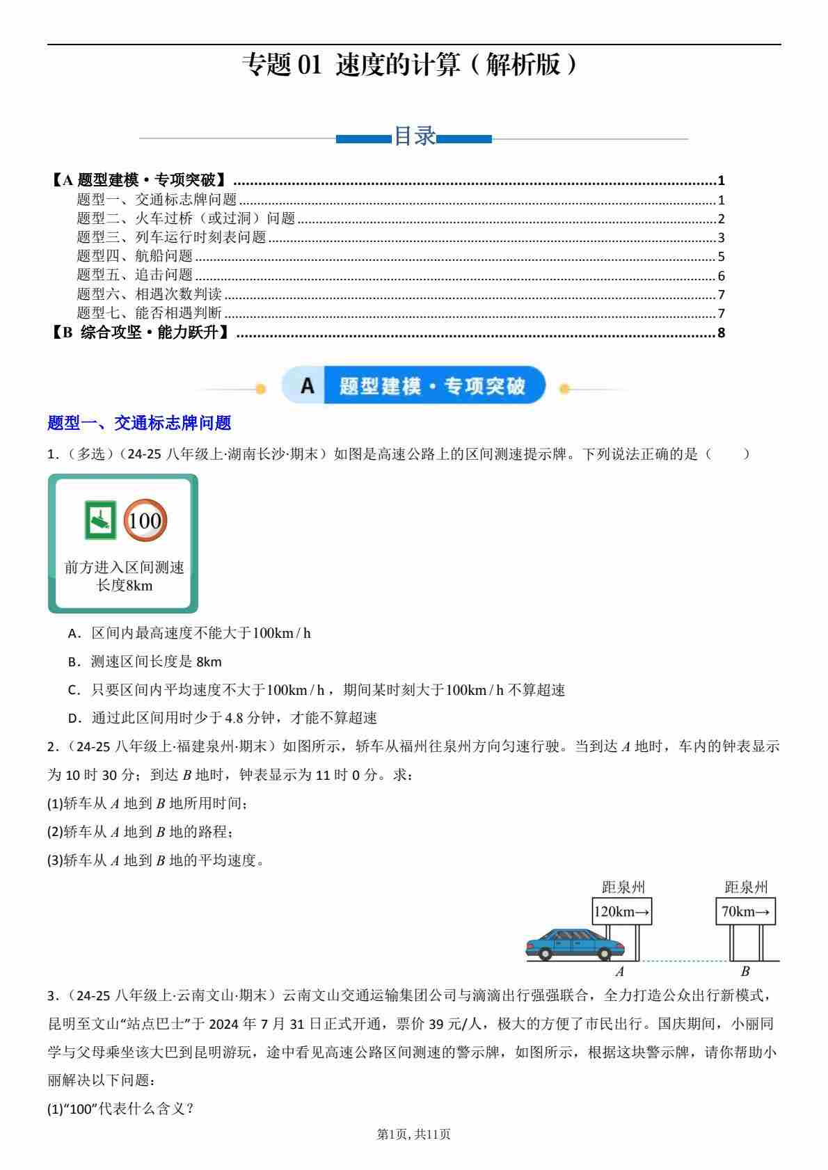 【八上人教物理】专题01 速度的计算及与运动图像分析(专项训练)(原卷版)
