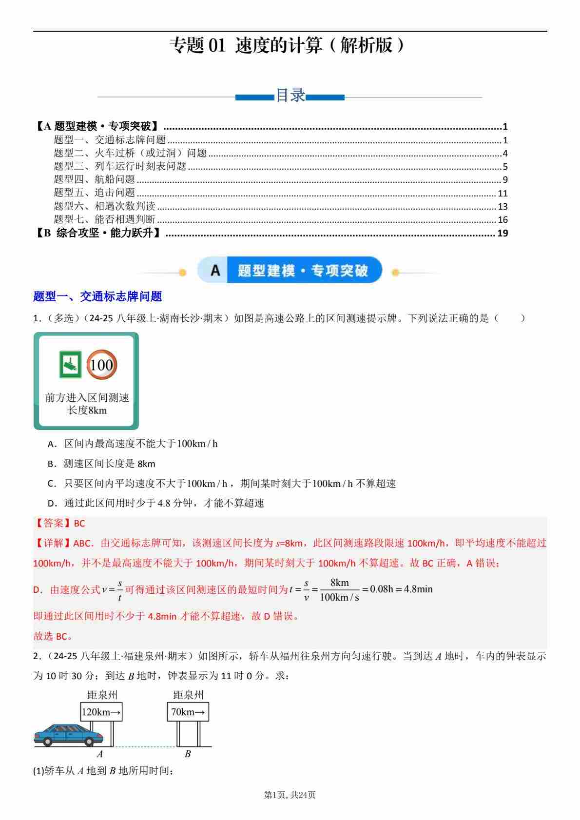 【八上人教物理】专题01 速度的计算及与运动图像分析(专项训练)(解析版)