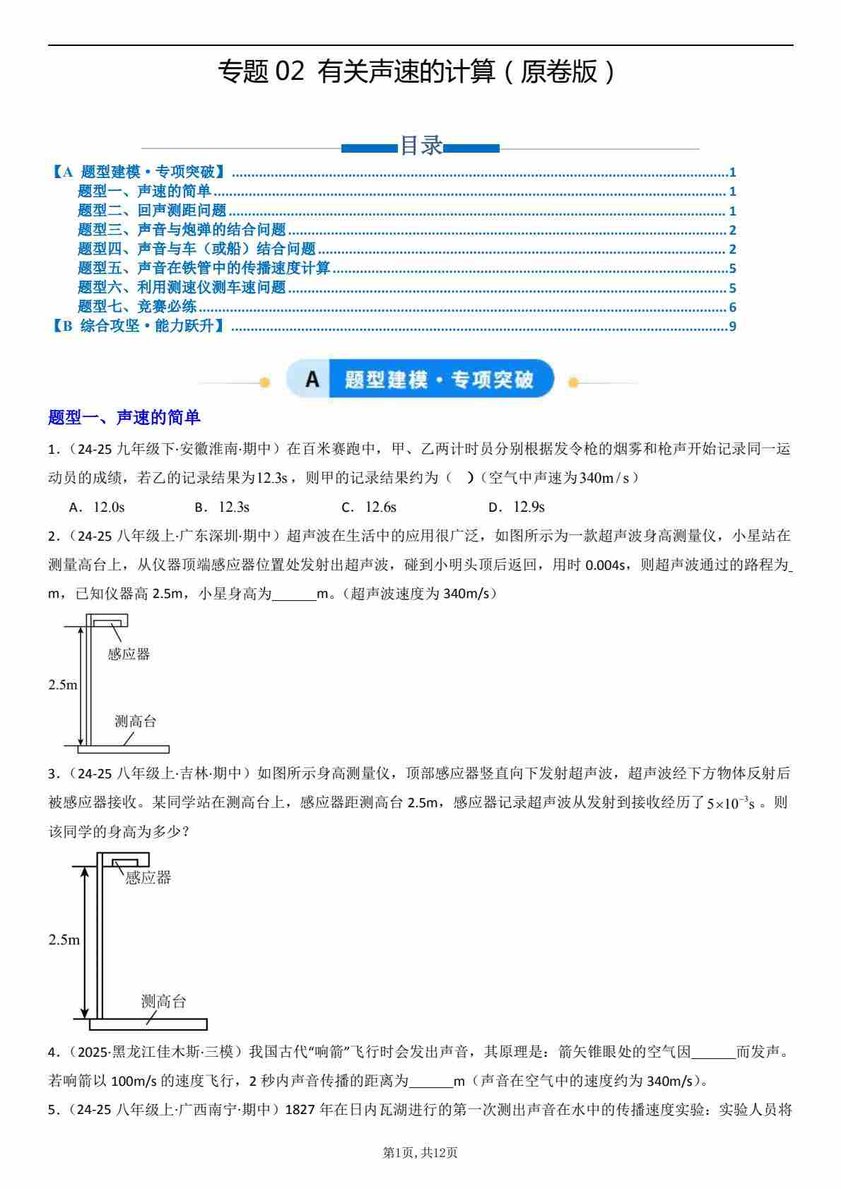 【八上人教物理】专题02 有关声速的计算(专项训练)(原卷版)