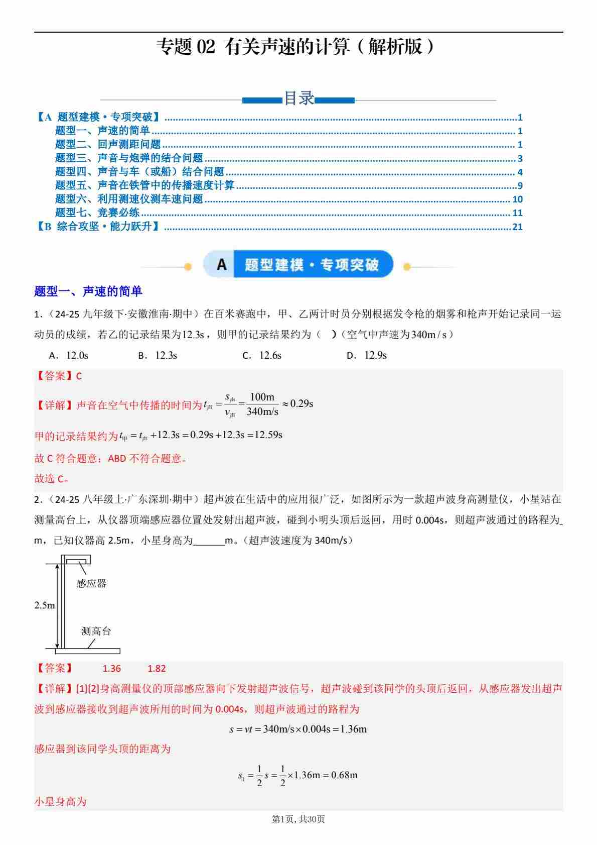 【八上人教物理】专题02 有关声速的计算(专项训练)(解析版)