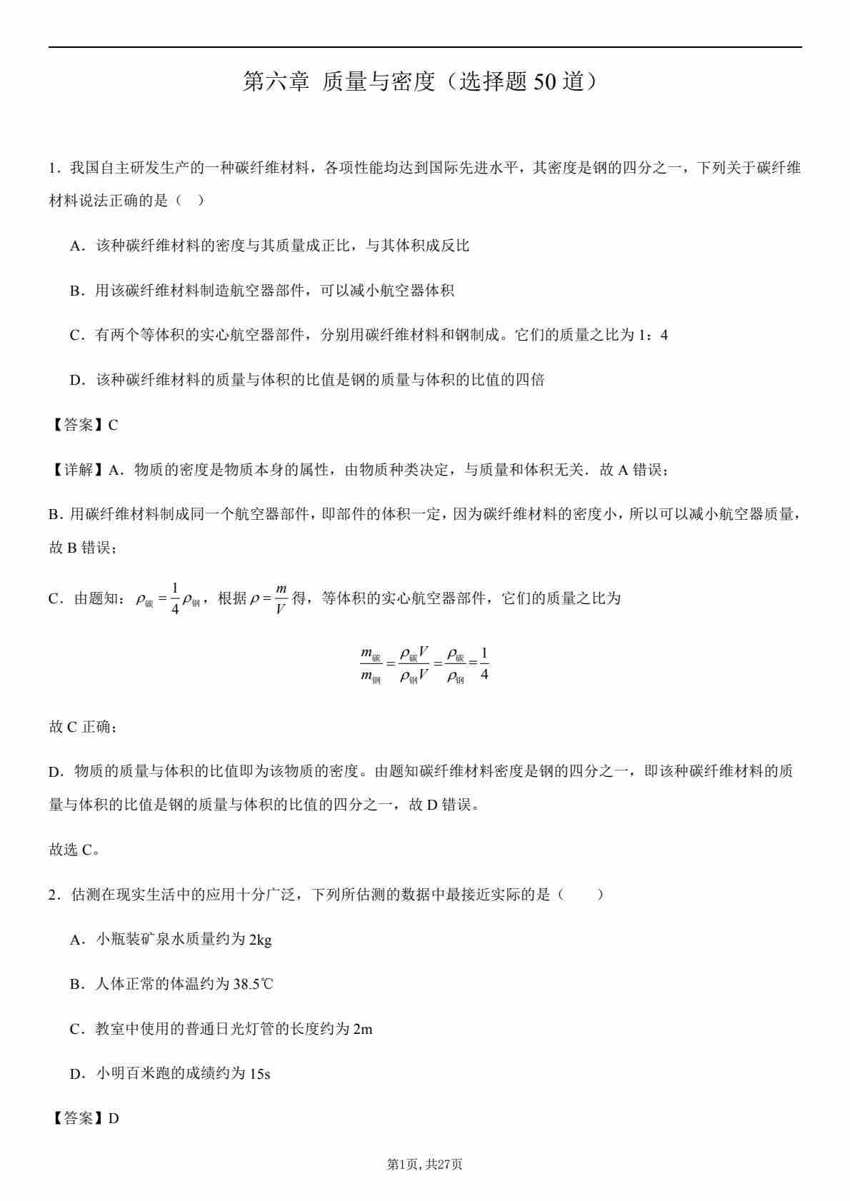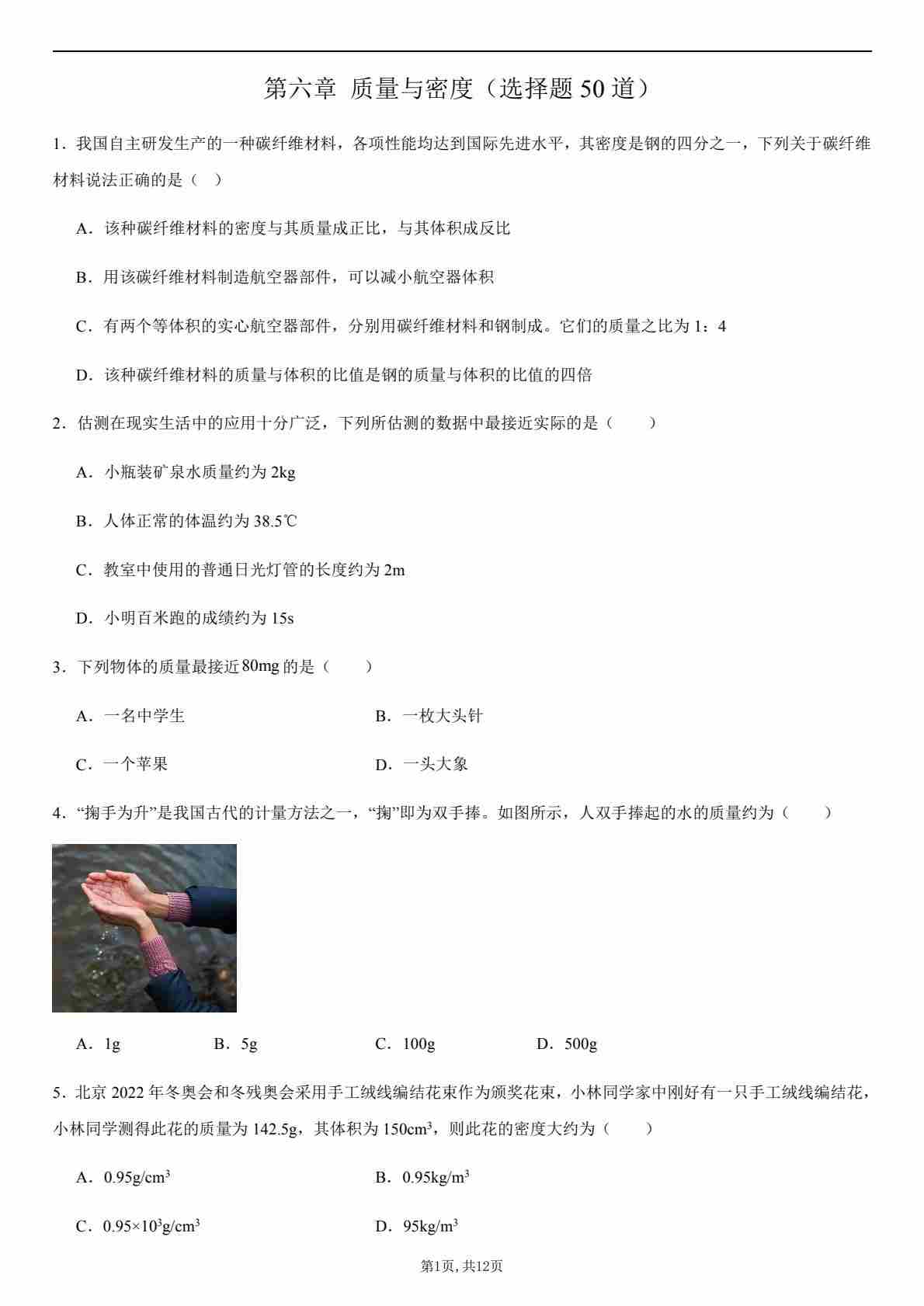 【八上人教物理】第六章 质量与密度(选择题50道)(原卷版)1