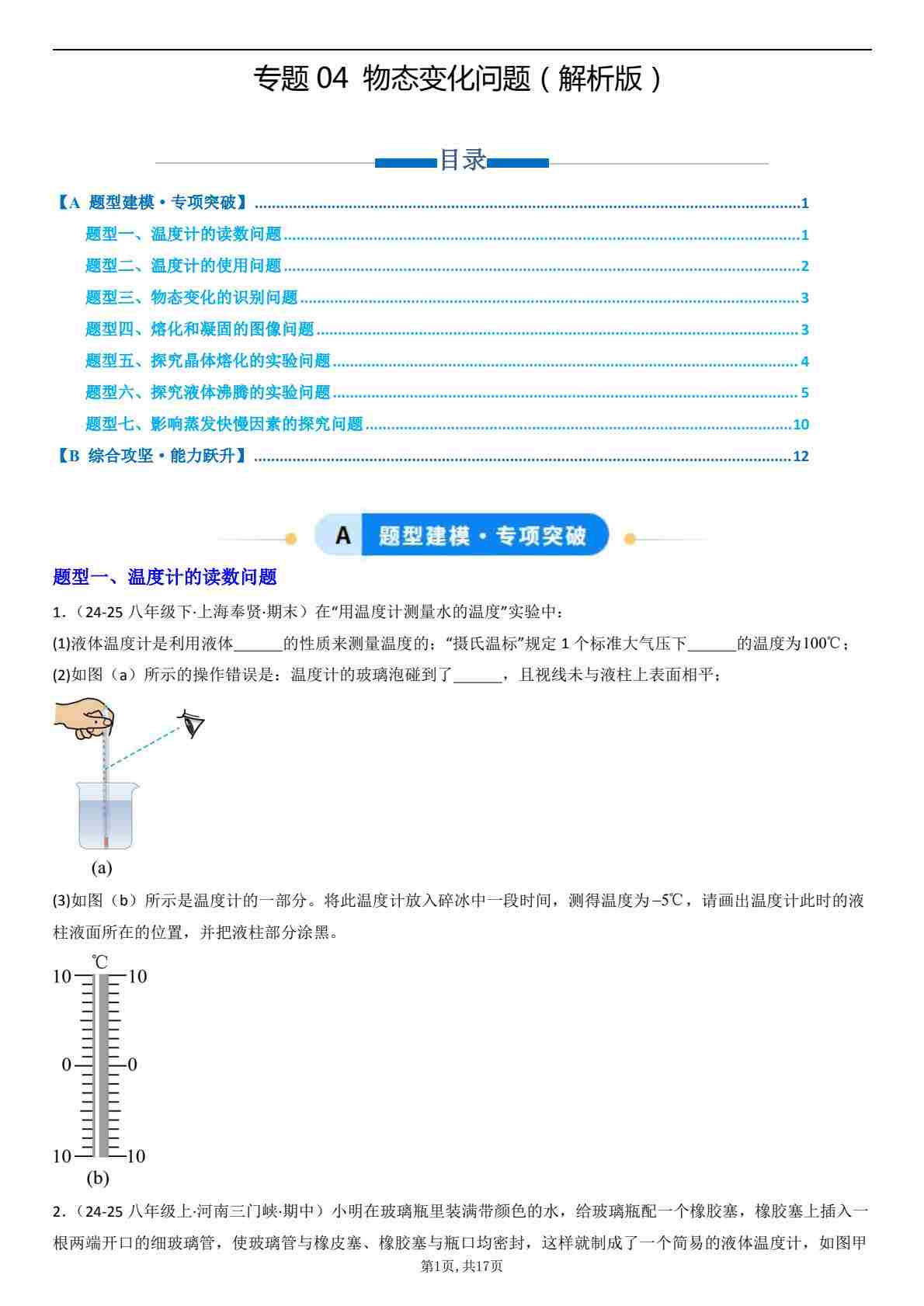 【八上人教物理】专题04 热学问题的求解方法(专项训练)(原卷版)