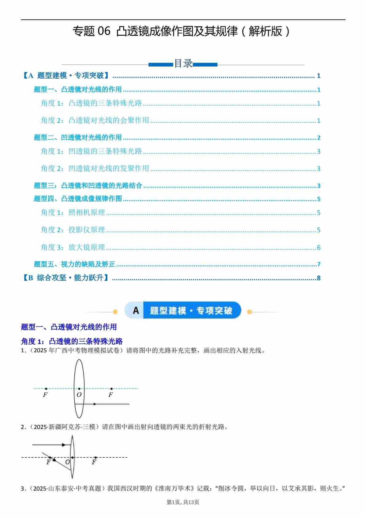 【八上人教物理】专题06 凸透镜成像作图及其规律(专项训练)原卷版