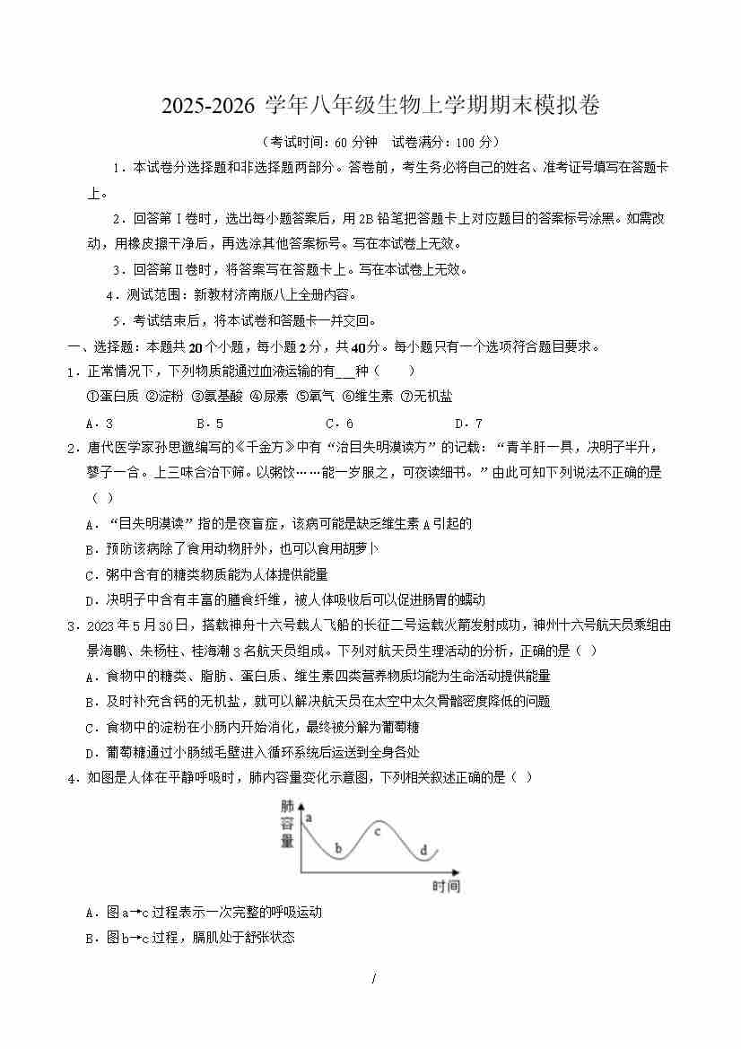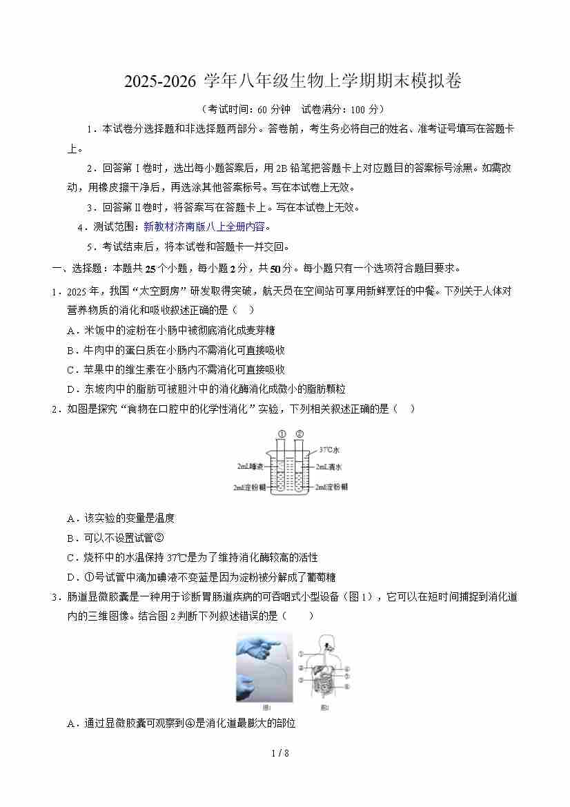 2025--2026学年济南版八年级上册生物期末模拟卷