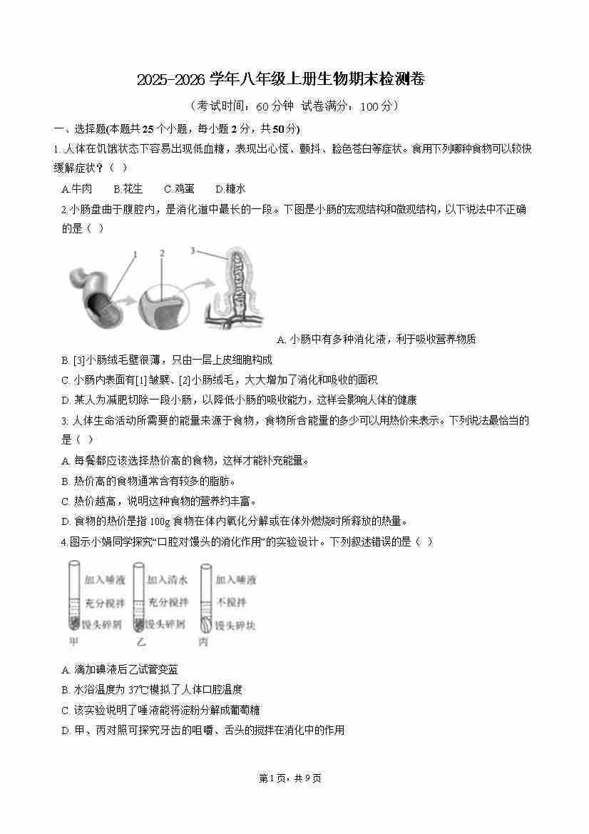 2025-2026学年济南版八年级生物上册期末测试题[t]