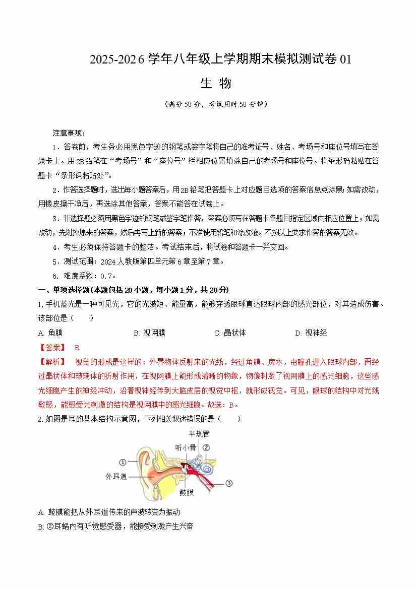 八上生物期末模拟测试卷01(新教材人教版)(全解全析)