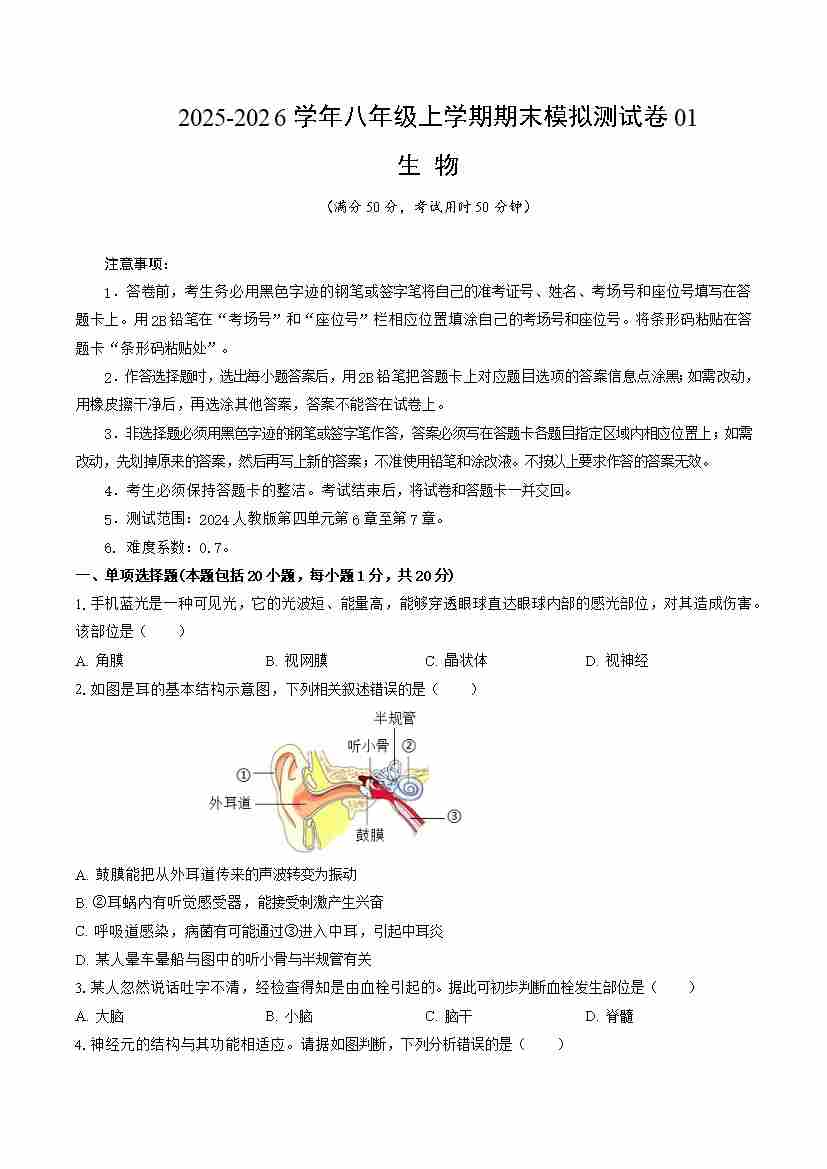 八上生物期末模拟测试卷01(新教材人教版)(考试版A4)