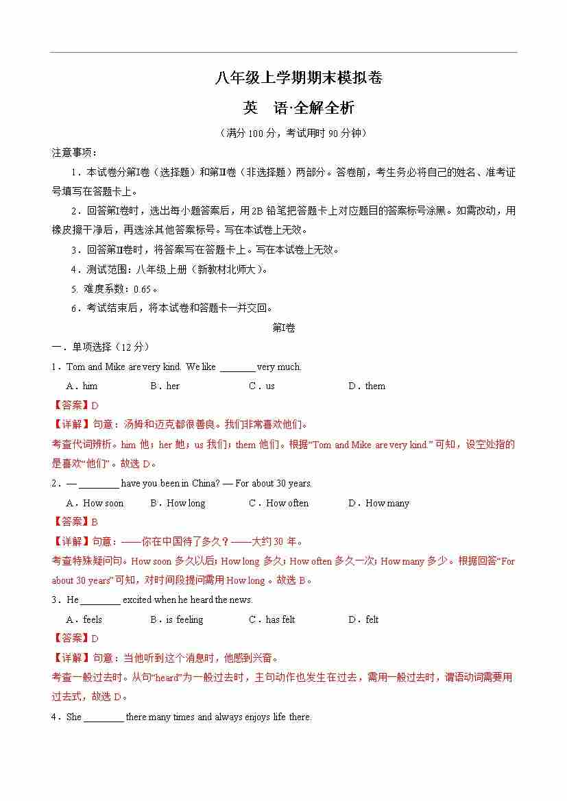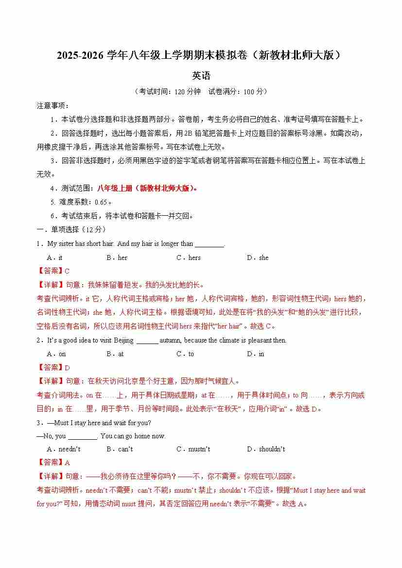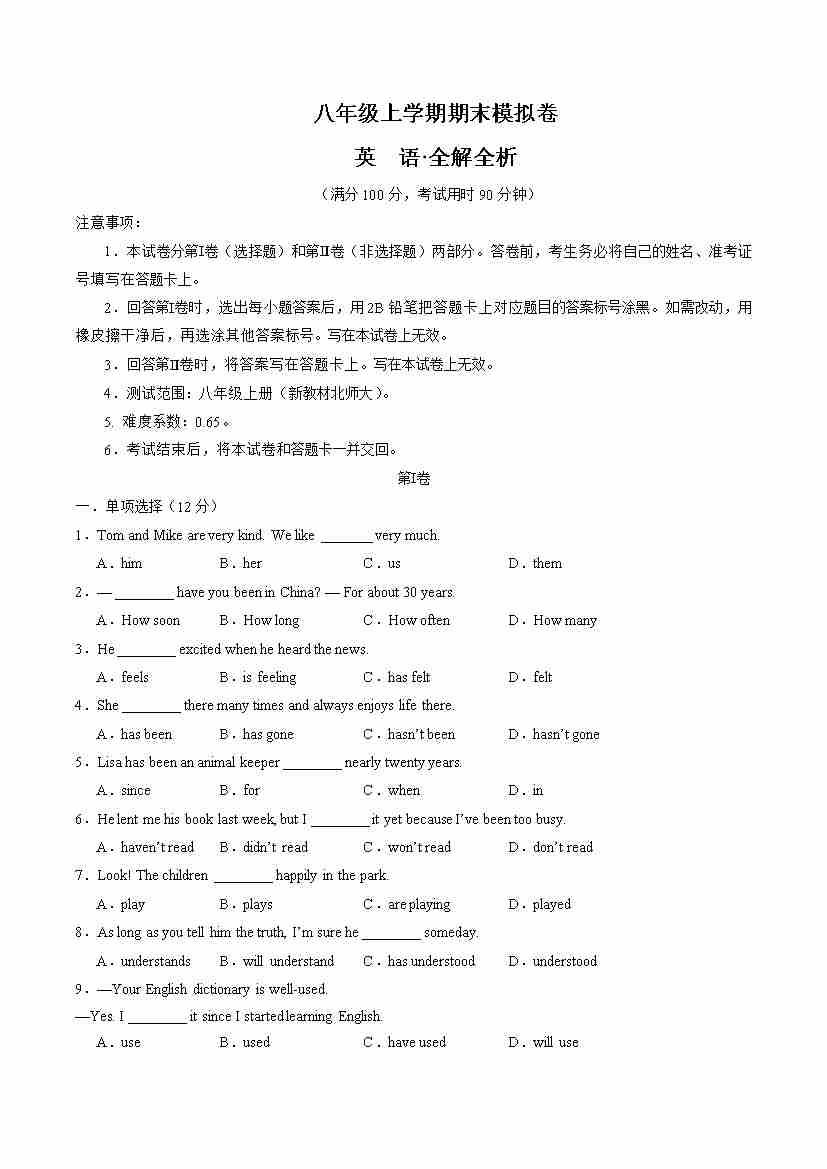 八年级英语上学期期末模拟卷(新教材北师大版)(解析版)