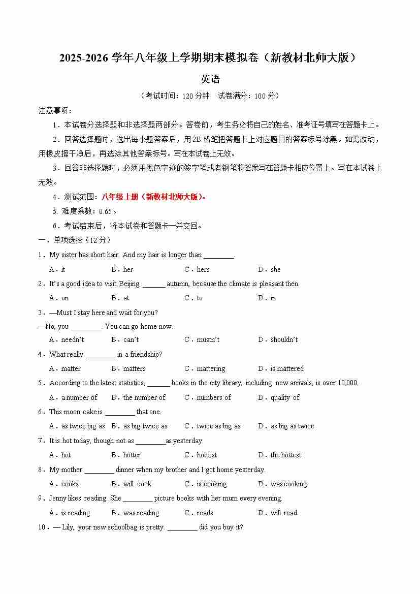 八年级英语期末模拟卷(考试版A4)(测试范围:八上全册)(新教材北师大版)