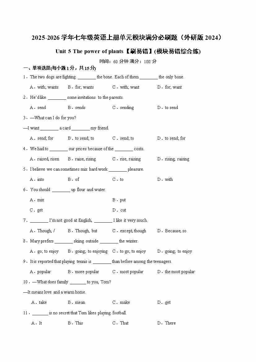 Unit 5(刷易错)(模块易错综合练)(原卷版)(外研版2024)