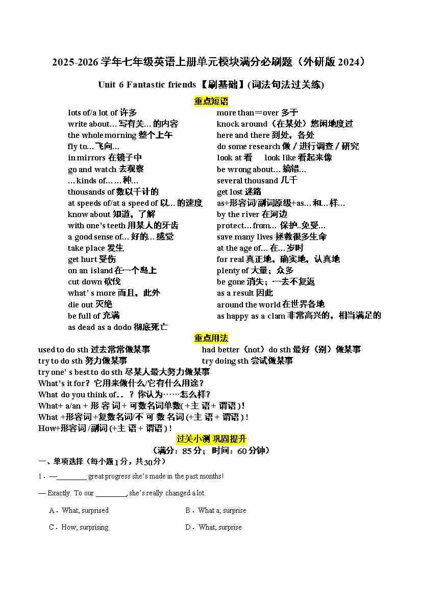 七年级Units1-6期末考前语法过关100题(原卷版)(外研版2024)