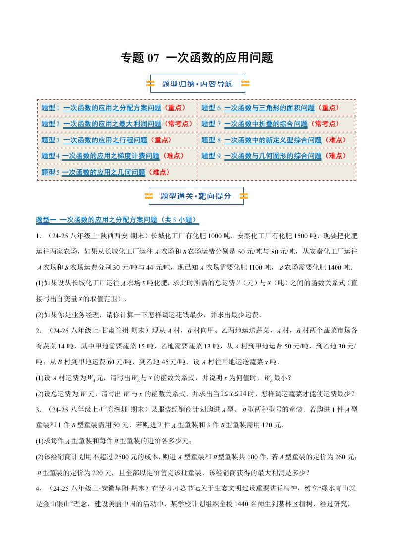 专题07 一次函数的应用问题(9大题型)(期末复习专项训练)(原卷版)