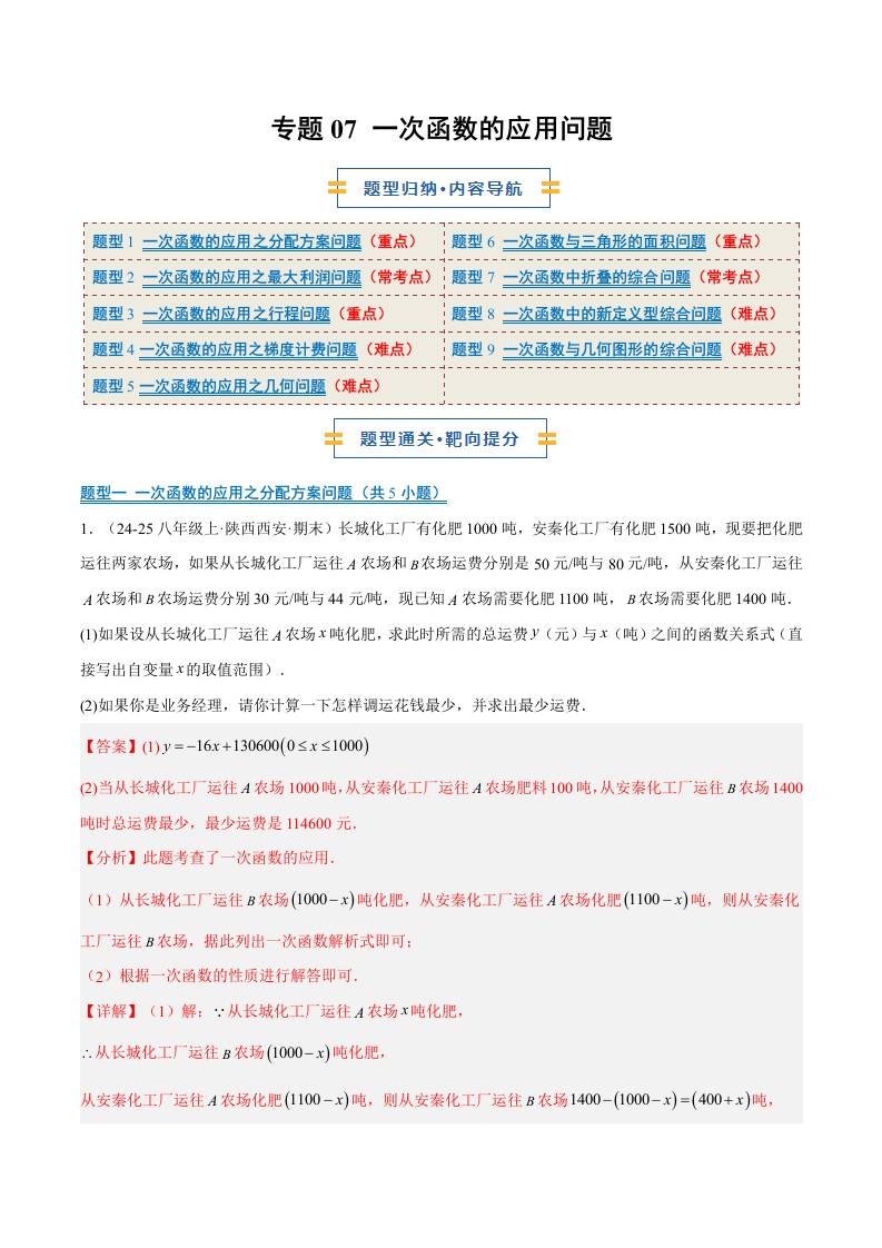 专题07 一次函数的应用问题(9大题型)(期末复习专项训练)(解析版)