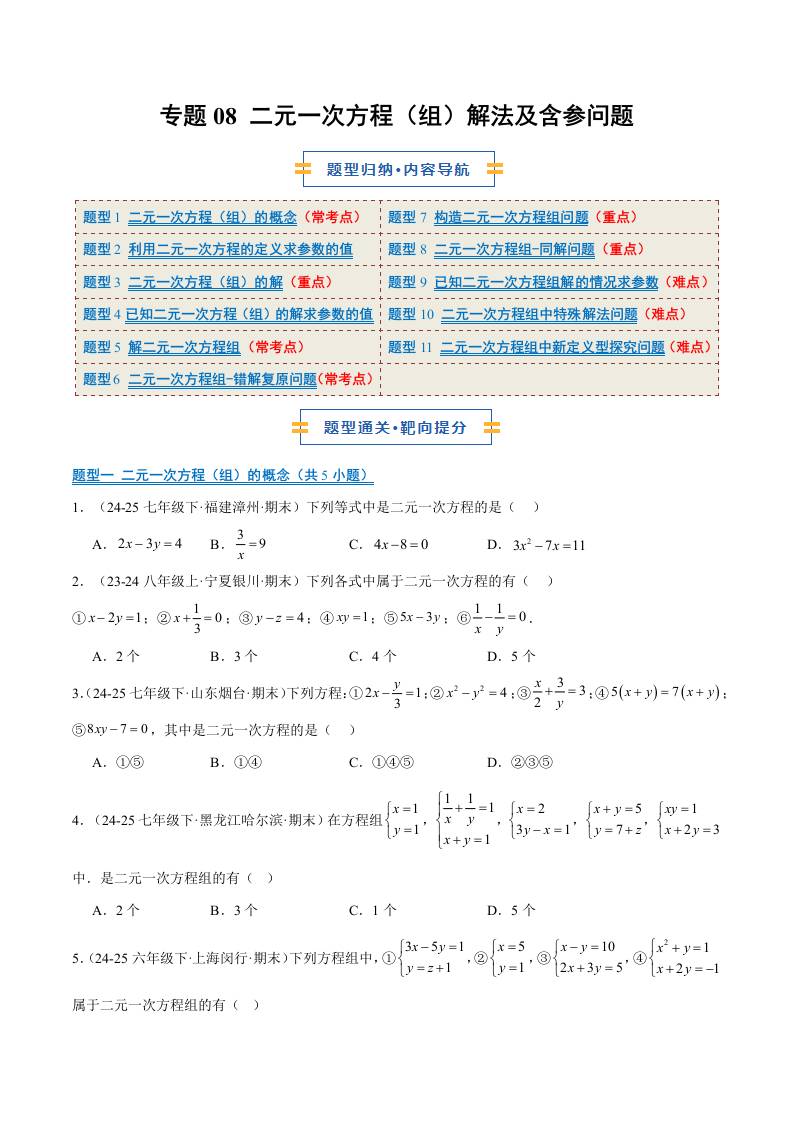 专题08 二元一次方程(组)解法及含参问题(11大题型)(期末复习专项训练)(原卷版)