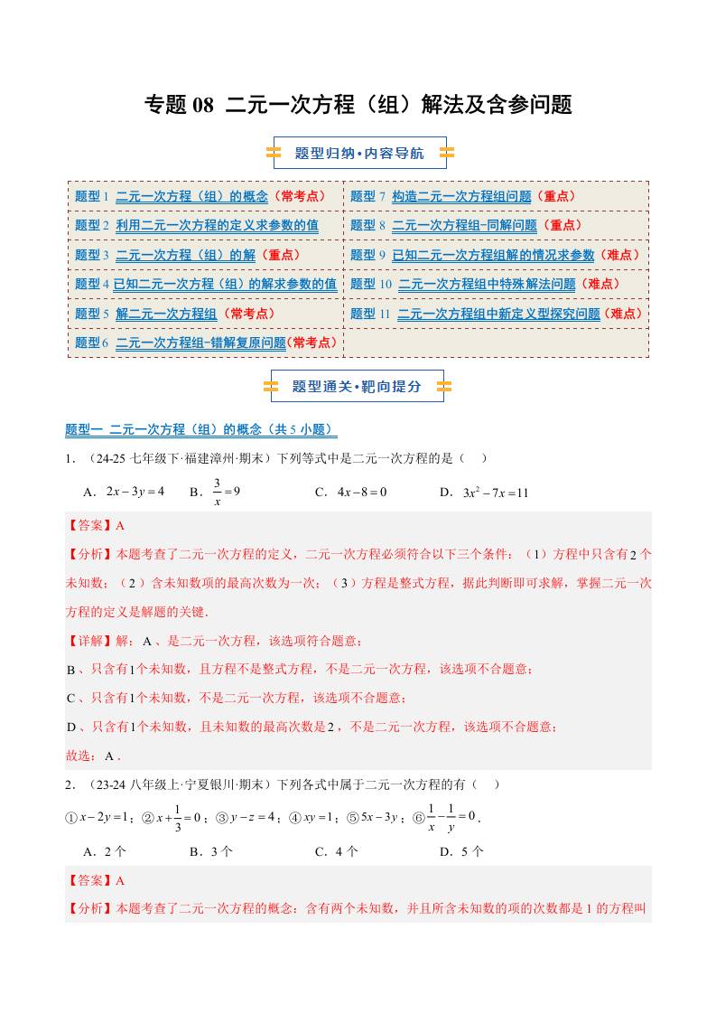 专题08 二元一次方程(组)解法及含参问题(11大题型)(期末复习专项训练)(解析版)