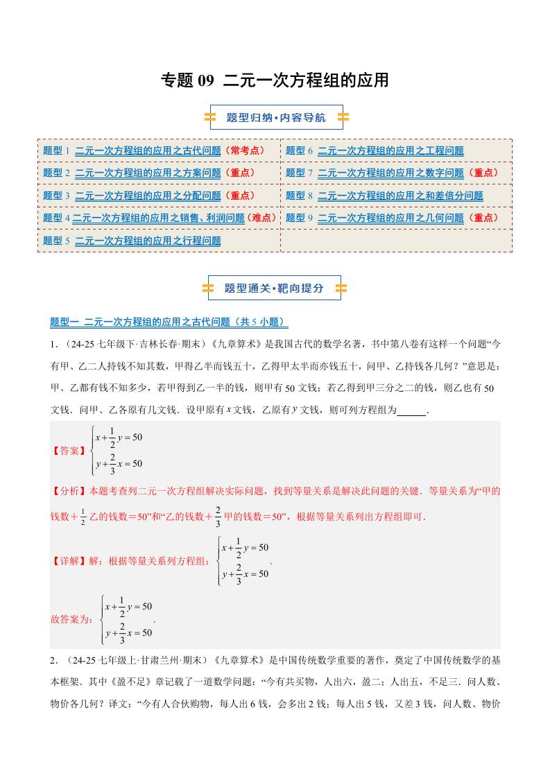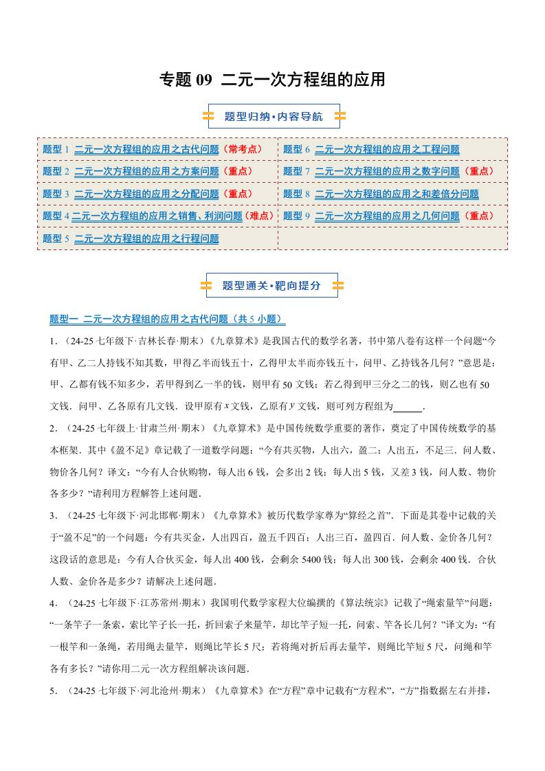 专题09 二元一次方程组的应用(9大题型)(期末复习专项训练)(原卷版)