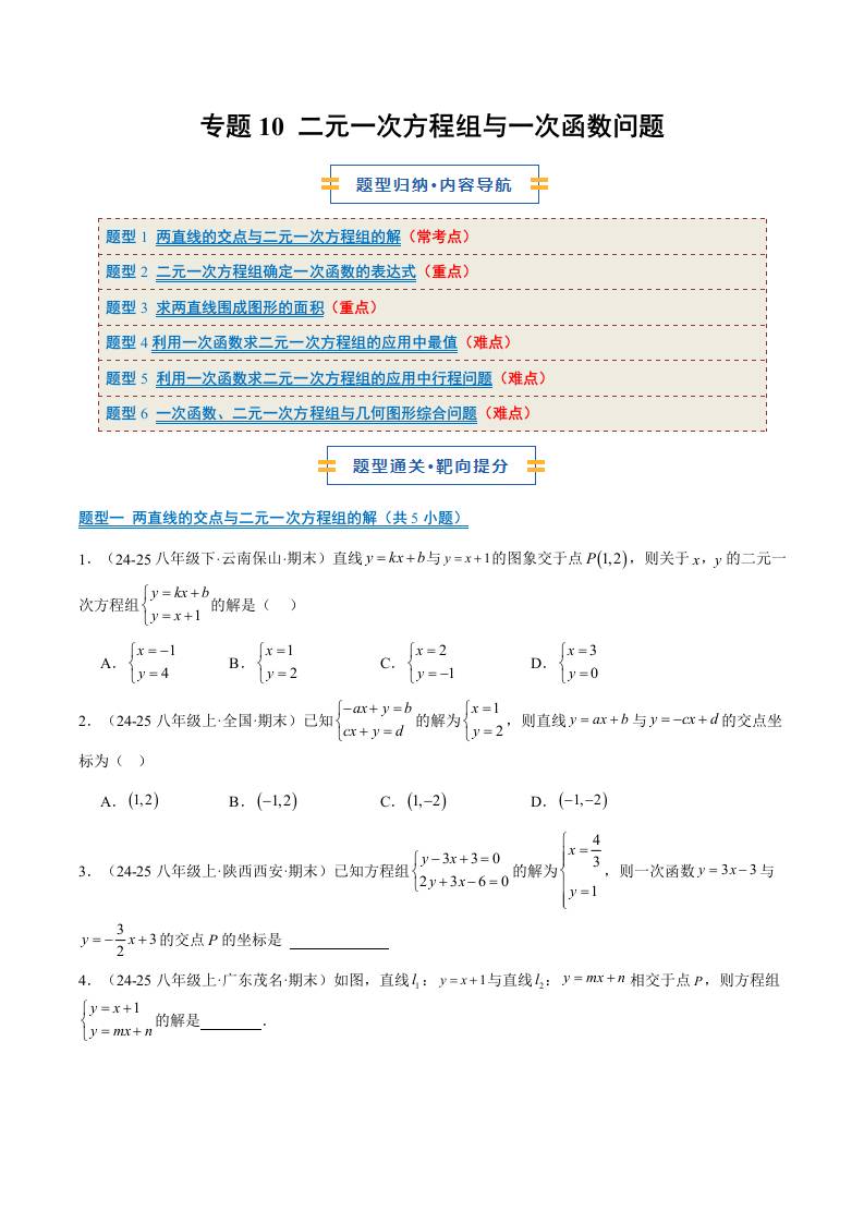 专题10 二元一次方程组与一次函数问题(6大题型)(期末复习专项训练)(原卷版)