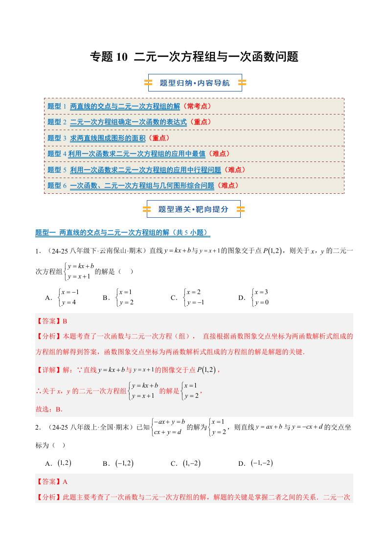 专题10 二元一次方程组与一次函数问题(6大题型)(期末复习专项训练)(解析版)