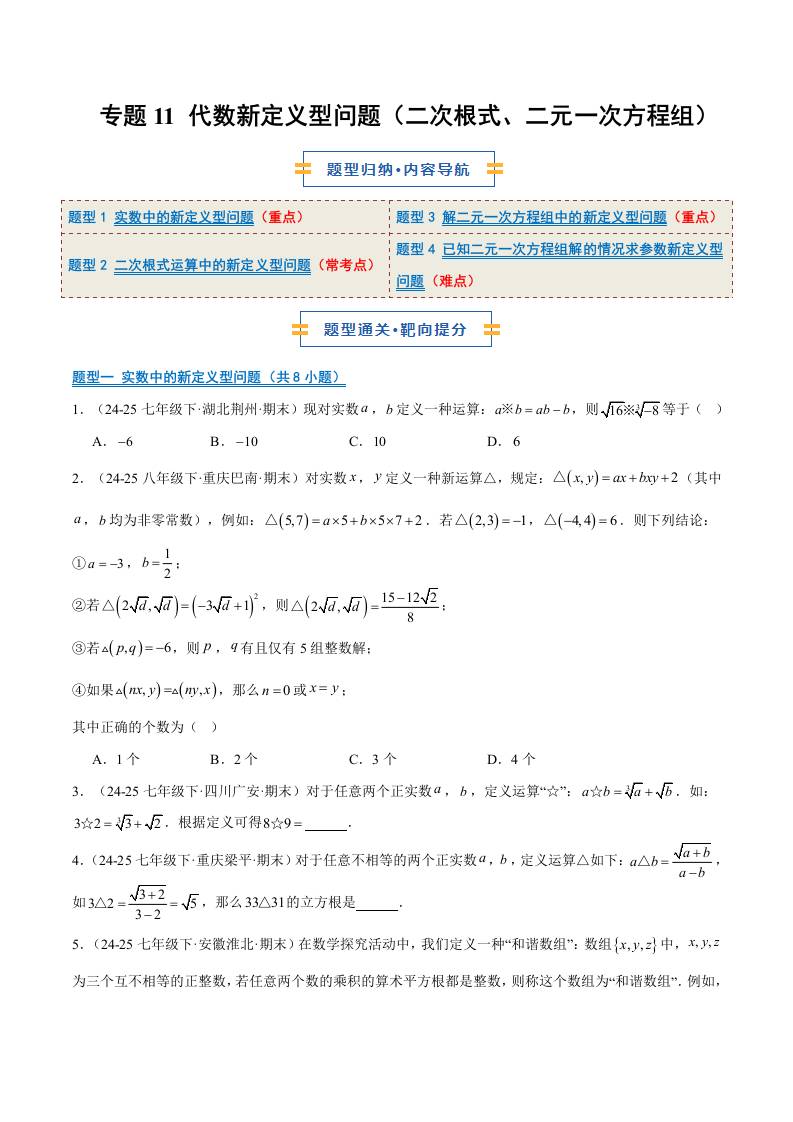 专题11 代数新定义型问题(二次根式、二元一次方程组)(4大题型)(期末复习专项训练)(原卷版)