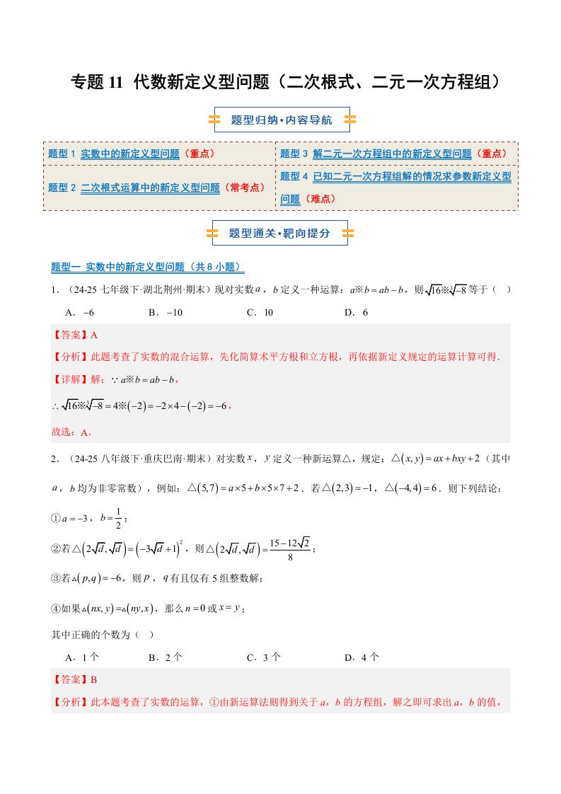 专题11 代数新定义型问题(二次根式、二元一次方程组)(4大题型)(期末复习专项训练)(解析版)
