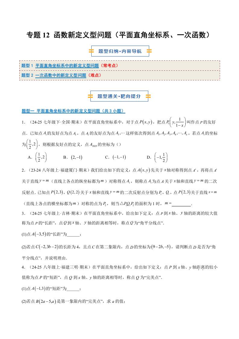 专题12 函数新定义型问题(平面直角坐标系、一次函数)(2大题型)(期末复习专项训练)(原卷版)