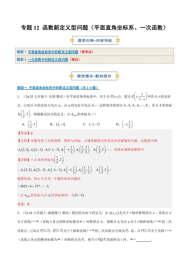 专题12 函数新定义型问题(平面直角坐标系、一次函数)(2大题型)(期末复习专项训练)(解析版)