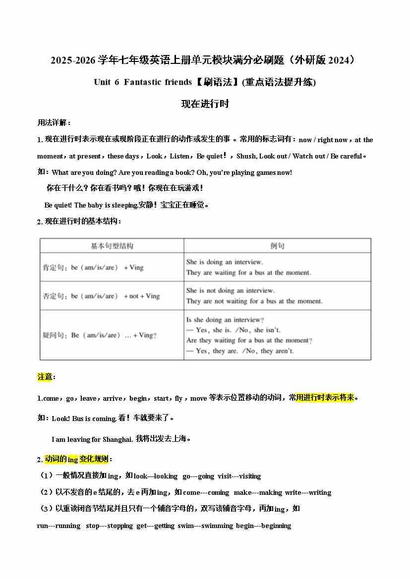 Unit 6(刷语法)现在进行时(重点语法提升练)(教师版)单元模块满分必刷题(外研版2024)