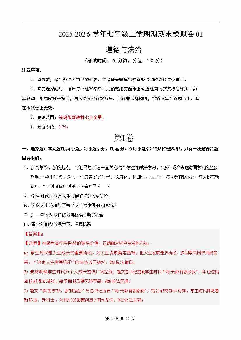 七年级道德与法治上学期期末模拟卷01(统编版新教材)(全解全析)
