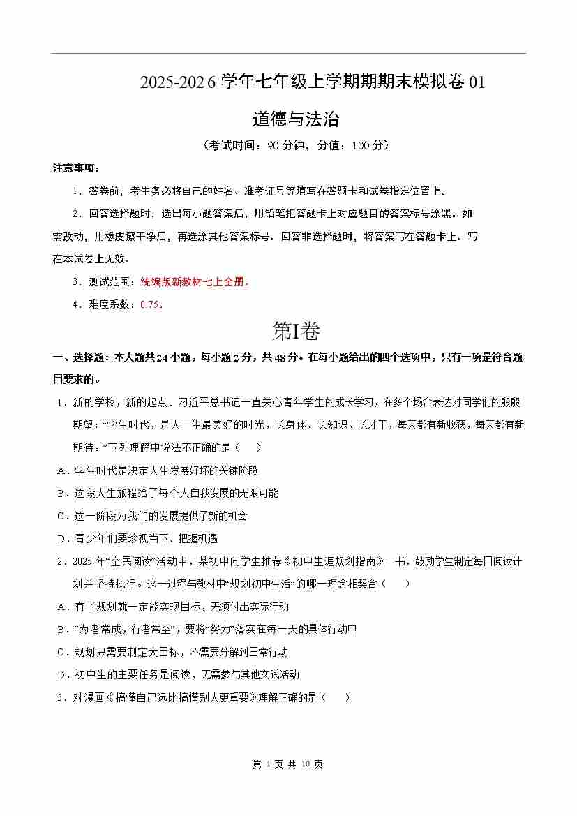 七年级道德与法治上学期期末模拟卷01(统编版新教材)(考试版A4)