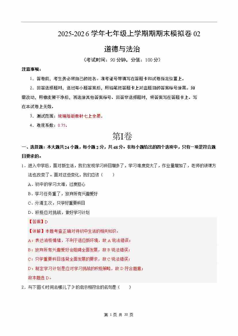 七年级道德与法治上学期期末模拟卷02(统编版新教材)(全解全析)
